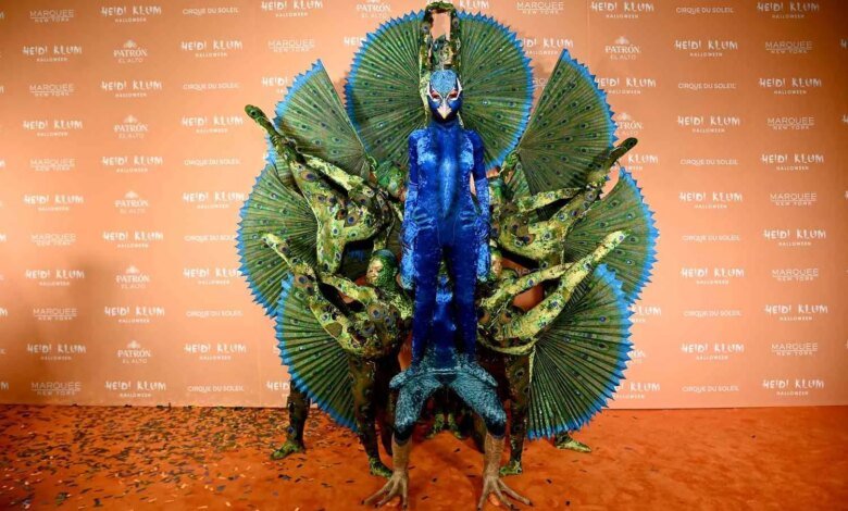 The year before, Klum recruited 15 performers to help fill out her costume as a peacock. She, dressed in all blue, portrayed the body of the bird, while her acrobatic performers made up the feathers.
