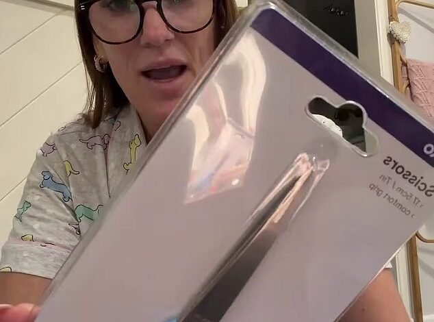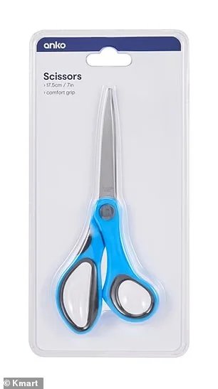 Holding up a packet of $2 Kmart Anko 7in. Scissors, the 40-year-old showed how the scissors are entrapped within the form-edged plastic package.