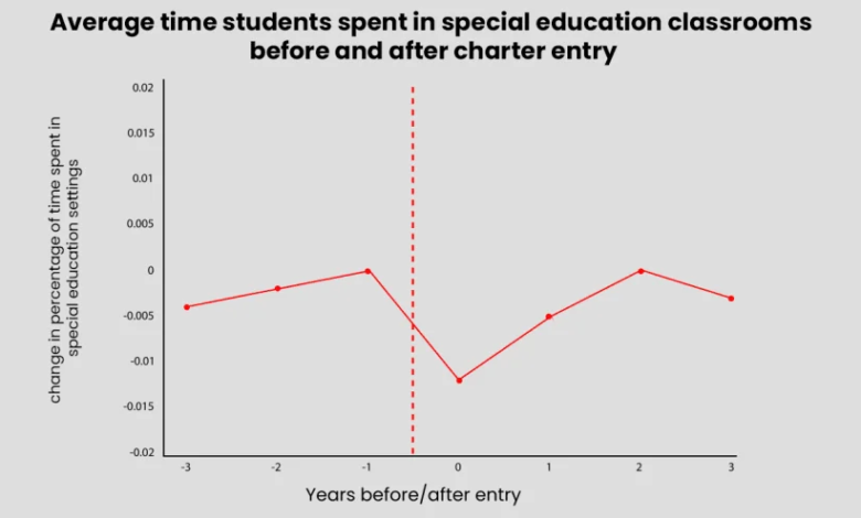 The study used students’ individualized education plans to see how special education services changed after enrollment in a charter school. Before switching, all students spent an average of 2.3% of their school day in a special education setting. The rate dropped to 1.2% immediately after entering a charter school but rebounded to pre-charter levels by the third year of enrollment.